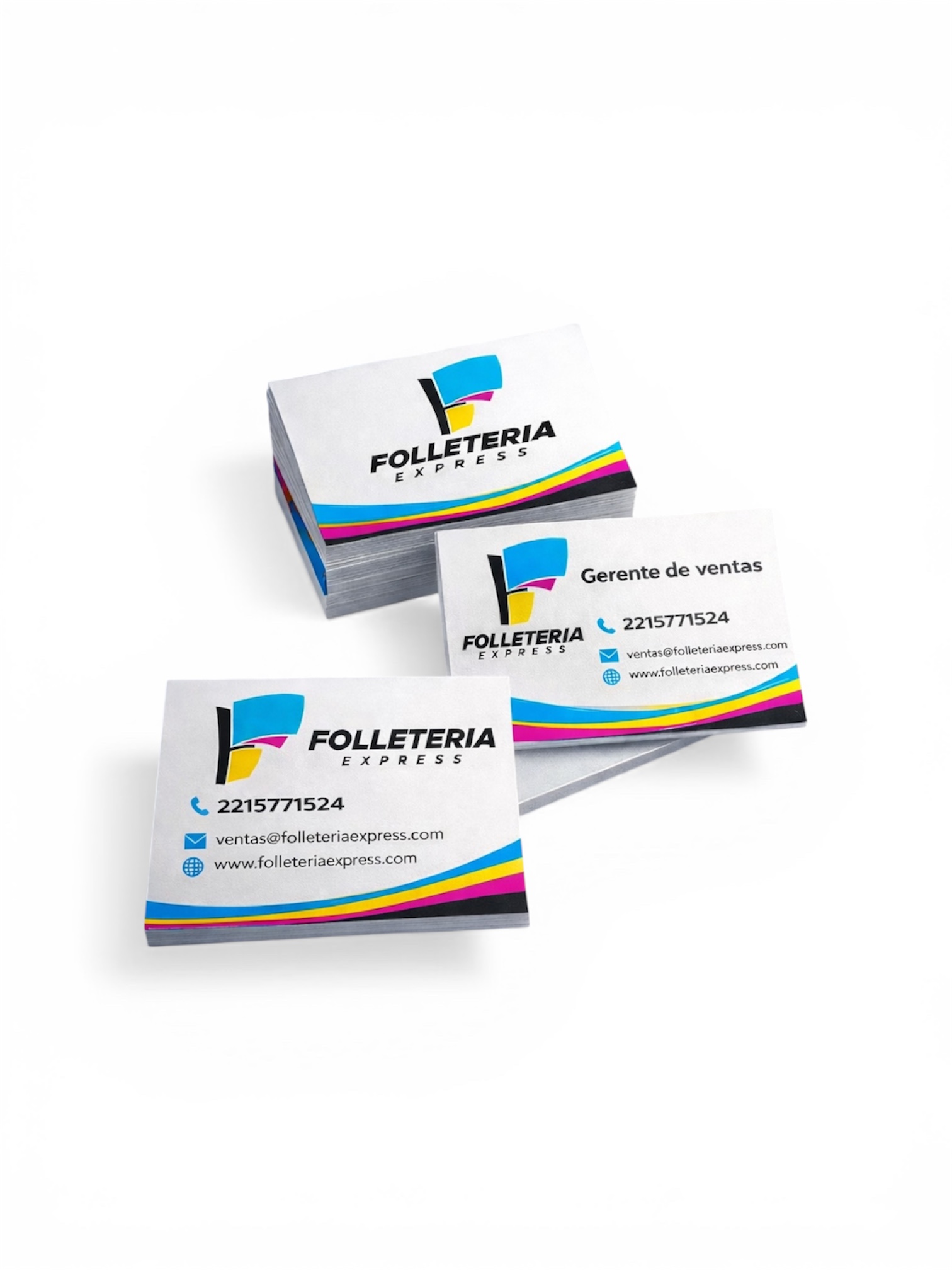 Especificaciones: 90x50mm o 85x55mm; 1 cara (4×0) / 2 caras (4×1 o 4×4); Papel couché 300-350g / opalina / kraft / reciclado; Acabados: mate/brillante, barniz UV, UV sectorizado, hot stamping, relieve, punta redonda; Opciones: QR, código de barras, troquel especial, canto pintado